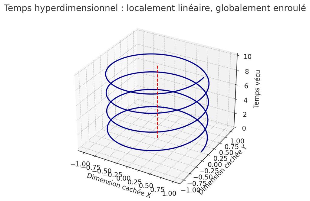 La ligne rouge en pointillés représente le temps classique, perçu comme une flèche unique. La spirale bleue illustre le temps hyperdimensionnel : localement, chaque pas est linéaire, mais globalement, le présent peut s’enrouler et produire un décalage.